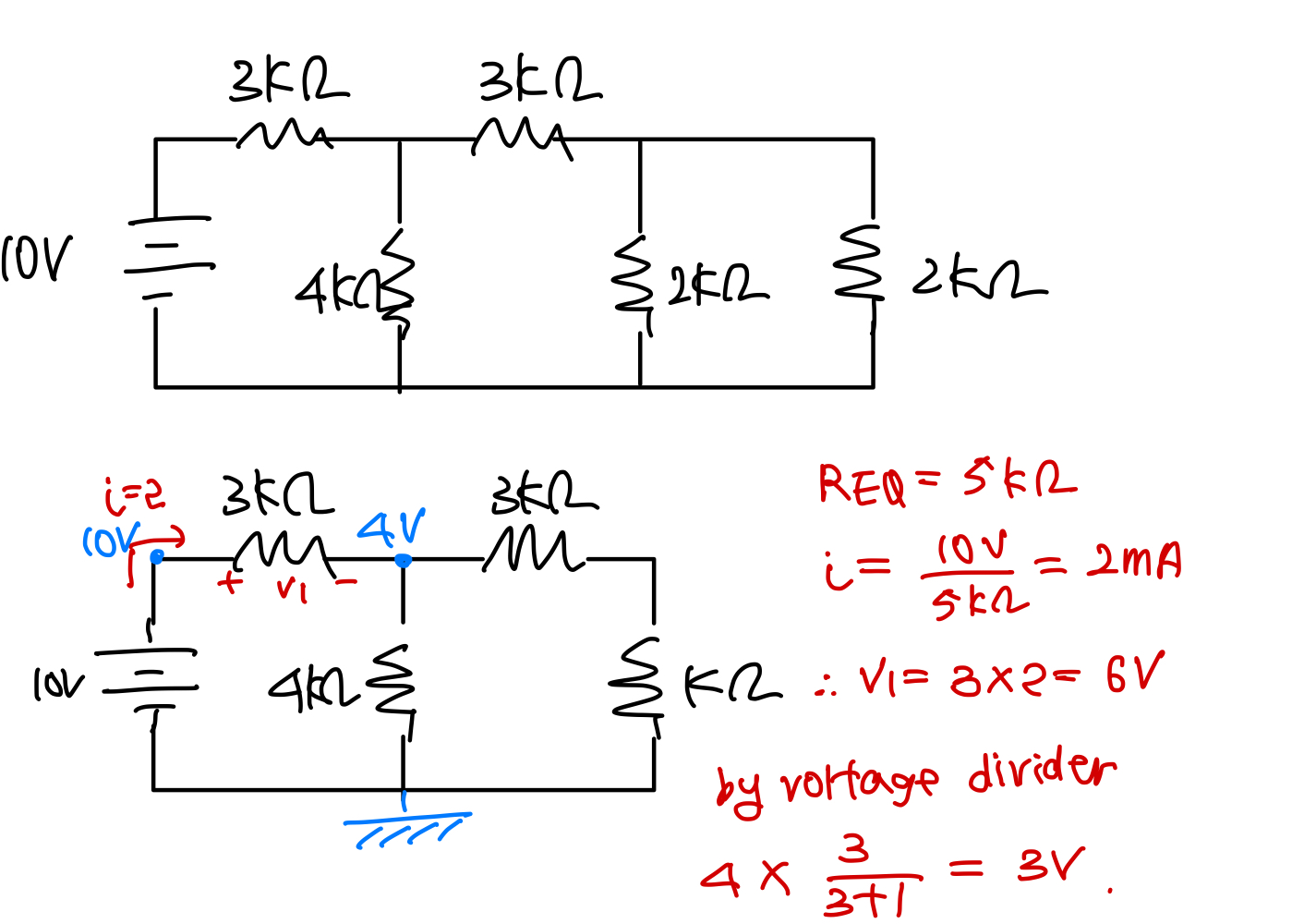 여기서 중요한 점은 current divider을 적용할 때 (얼만큼 전류를 이쪽에 보낼 것인지 결정할 때) 해당 branch만 고려하는 것이 아니라 그 뒤에 연결된 부수적인 것들도 적용해서 R'eq를 고려해서 해야한다. 예를 들어서 첫번째 3kΩ을 거치고 다음 노드에서 current divider가 일어날 때 3kΩ, 4kΩ으로 갈라지는데 전류가 1:1로 갈라지는 이유가 뒤에 2kΩ || 2kΩ 회로가 있기 때문이다!!!