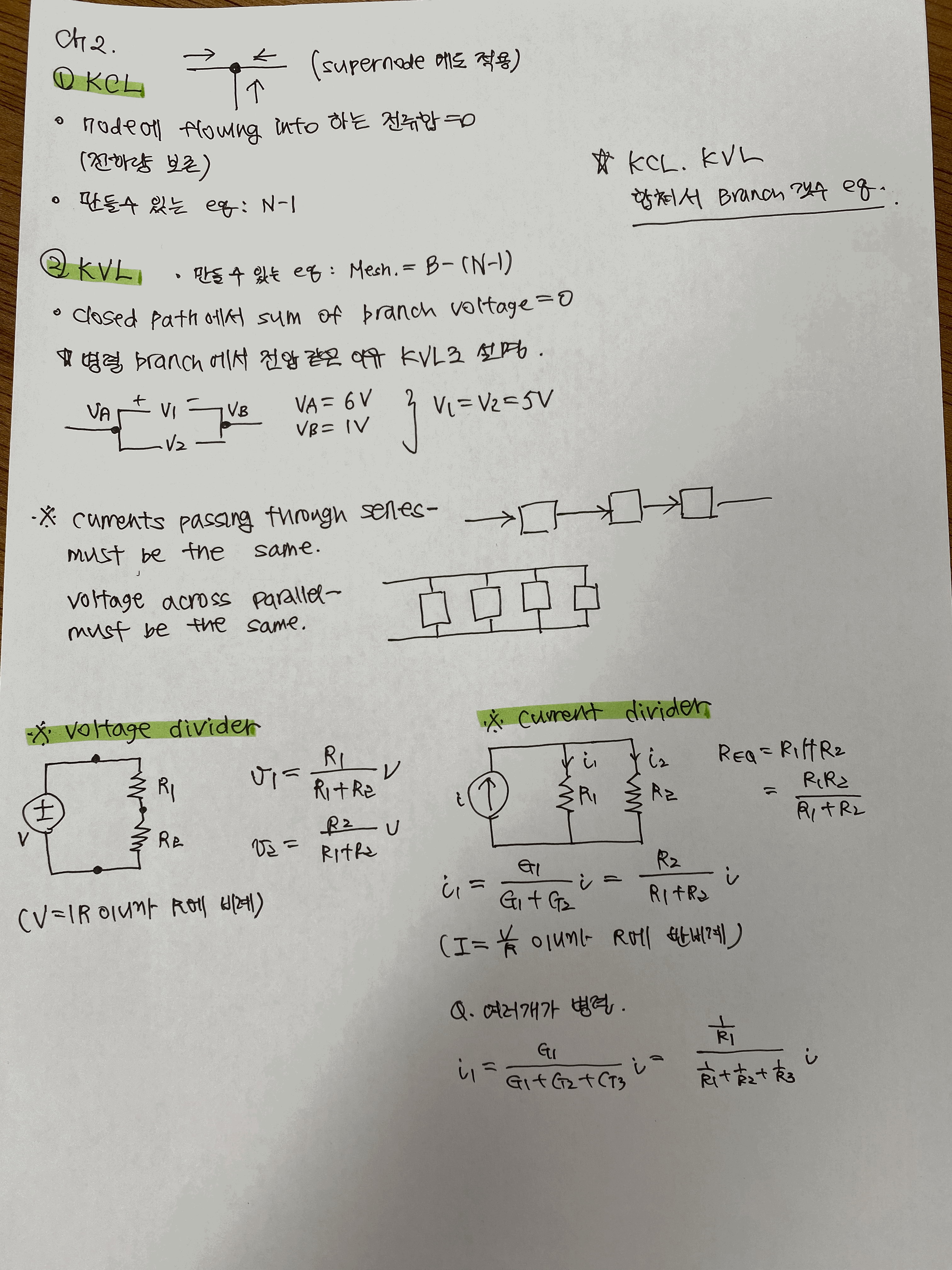 2) KVL을 사용할 때는 current source는 통과시키지 않는 것이 포인트이다. cs를 지나지 않는 loop에서 KVL을 적용하면 된다. 자세한 풀이과정은 아래 필기를 보면 된다.
